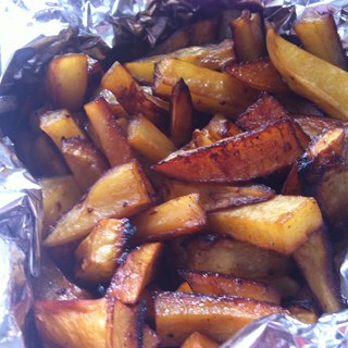 原料:土豆、盐、橄榄油、黑胡椒粉、蜂蜜、烤肉酱。