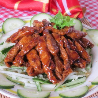 原料:里脊肉、青瓜、料酒、甜面酱、鸡精、糖、盐、淀粉、姜末、青葱。