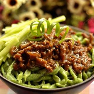 原料:面条、肉沫、黄瓜丝、葱末、蒜末、黄豆酱、生抽。