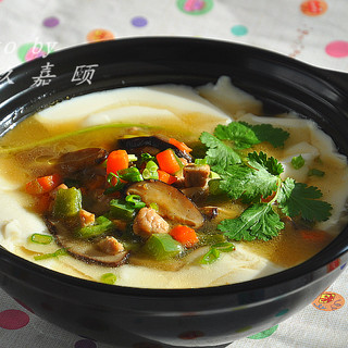 原料:干豆、内酯、清水、香菇、青椒、胡萝卜、猪里脊肉、香葱、香菜。