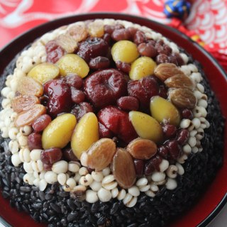 原料:乌米饭、豆沙、银杏、红枣、葡萄干、薏米仁、蜜豆、桂花酱、砂糖。