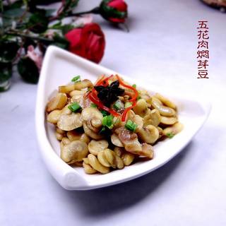 原料:去皮泡芽豆、五花肉、香葱粒、甜椒丝、葱段、姜片、八角、绍酒、鲜酱油、蚝油、白糖、味精、白胡椒粉、水淀粉、烹调油。