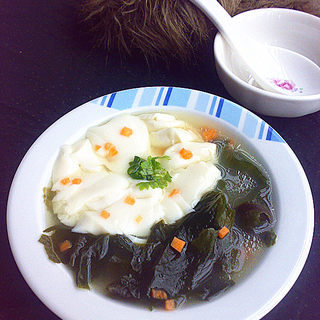 原料:史云生原汁上汤、螺旋藻、豆花、水、红萝卜、姜、葱、香菜、胡椒粉、色拉油、麻油。
