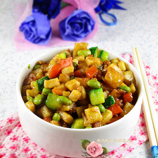 原料:面疙瘩、肉馅、青豆、胡萝卜、土豆、黄瓜、葱姜、料酒、酱油、糖、盐。