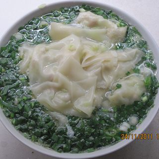 原料:卷心菜、猪肉、面皮、葱、韭菜、香菜、盐、鸡精、醋。
