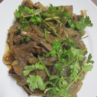 原料:猪肝、洋葱、青椒、香菜、盐。