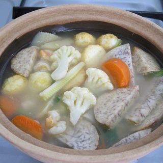 原料:芋头、鹌鹑蛋、日本豆付、红罗卜、白椰菜、幼笋、小玉米、虾仁、青蒜。