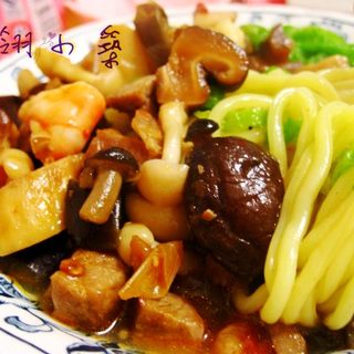 原料:茄子、香菇、青豆、海米、杏鲍菇、鸿禧菇、白玉菇、青虾、鸡腿肉、猪里脊肉、白菜叶、干面、辣椒酱、海鲜酱。