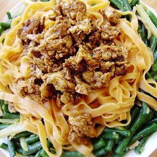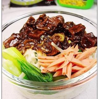 原料:面条、熟肉末、青椒末、黄瓜丝、葱末、色拉油、欣和葱伴侣豆瓣酱。