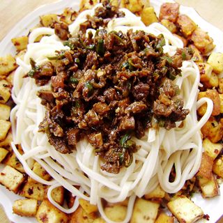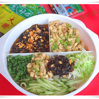 原料:豆腐、面条、色拉油、葱末、姜末、精盐、五香粉、味精、欣和葱伴侣豆瓣酱、辣椒油。