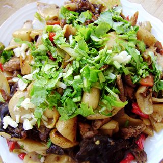 原料:面粉、木耳、香菇、胡萝卜、小白菜、青椒、葱末、姜末、蒜末、豆瓣酱。