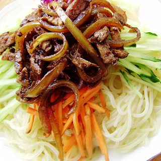 原料:面条、土豆、洋葱、猪肉、花生油、欣和甜面酱、料酒、酱油、葱、姜、蒜、盐、味精。