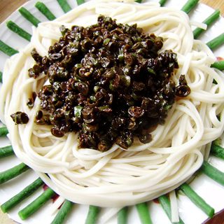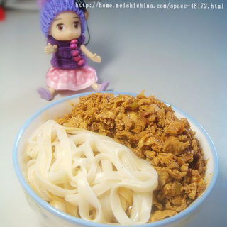 原料:豇豆、挂面、色拉油、葱末、姜末、欣和葱伴侣豆瓣酱、精盐、五香粉、味精、姜末、白糖。