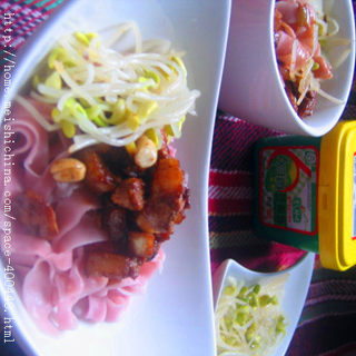 原料:猪肉、茭白、花生、苋菜、黄豆芽、面粉、淀粉、葱、姜、白糖、欣和葱伴侣豆瓣酱、甜面酱、料酒、植物油。