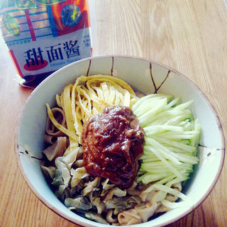 原料:芝麻酱、花生酱、甜面酱、白面、水、黄瓜、榨菜、香油、白糖、料酒。
