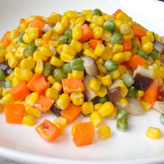 原料:玉米罐头、香菇、青豆、胡萝卜、精盐、鸡精、高汤(清水)。