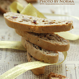 原料:全蛋、低筋面粉、熟核桃仁、熟花生仁、生瓜子仁、葡萄干、蔓越莓干、泡打粉、盐、细砂糖、红糖。