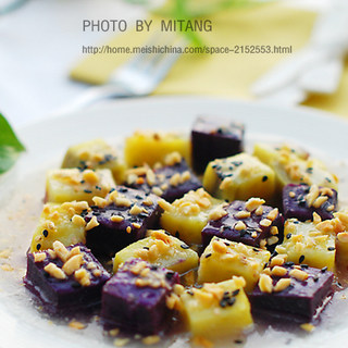 原料:红薯、紫薯、花生、芝麻、糖、盐、水淀粉、色拉油。