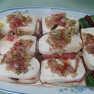 原料:老豆腐、鲨鱼肉、火腿肠、姜、洋葱、蒜头、蚝油、腐乳。