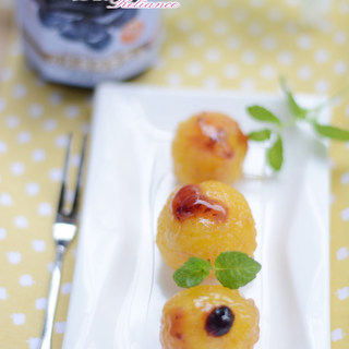 原料:山药、吉士粉、玉米淀粉、牛奶、调和油、白糖、蓝莓果酱。
