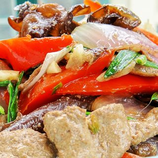 原料:羊肝、木耳、洋葱、红椒、姜、蒜子、蒜苗、生粉、黄酒、生抽、盐、鸡精。