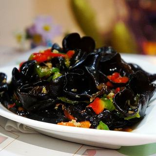 原料:黑木耳、青椒、红椒、花生油、盐、蒜、美极鲜酱油、老陈醋。
