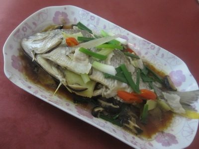 原料:黄鲷鱼、姜、葱、红辣椒、五花肉、香菇、生抽、味精、油。