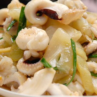 原料:猪梅花肉、鱿鱼、豆腐干、蒜头、蒜苗、芹菜、潮州豆瓣酱、辣椒、白糖、老抽、番茄酱、白醋、糯米酒。