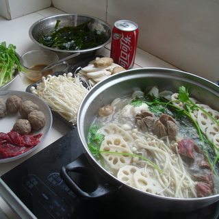 原料:牛肉、牛肉丸、白萝卜、猪腿骨、金针菇、杏鲍菇、莲藕、海带、香菜、沙茶酱、老干妈、酱油、可口可乐。
