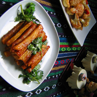 原料:剥皮牛、面筋、姜葱、油盐、生抽、糖。