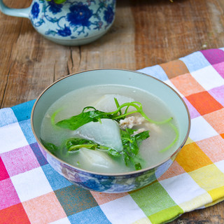 原料:肉丸、小白菜、萝卜、盐、香油、鸡精。