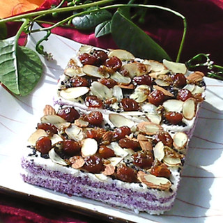 原料:粘米粉、糯米粉、紫薯馅、白糖、猪油、香草粉、水、桂花酱、熟黑芝麻、樱桃干、杏仁。