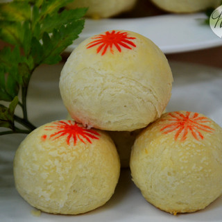 原料:面粉、黄油、温水、糖、鸡蛋、面粉、猪油、莲蓉馅心、食用色素。
