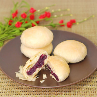 原料:中筋面粉、猪油、糖粉、盐、水、低筋面粉、紫薯馅、紫薯泥、细砂糖、奶粉、盐、牛奶、糯米粉、黄油、食用油。