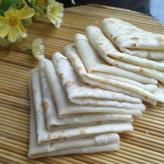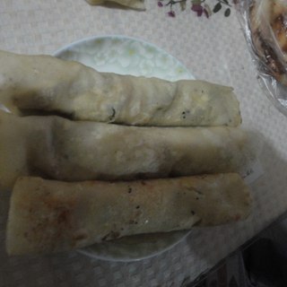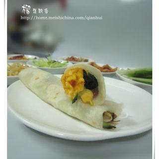 原料:春饼、紫甘蓝、火腿、青椒、木耳、葱花、油、盐、花椒、鸡粉。