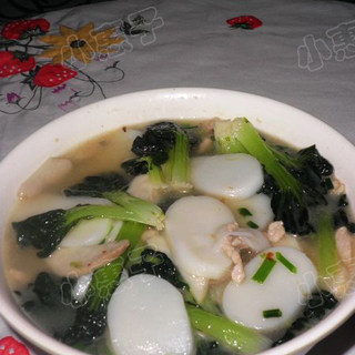 原料:年糕、精肉、鸡腿菇、塔苦菜、葱、鸡精、盐。