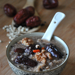 原料:大米、薏米、燕麦、黑米、小米、大枣、核桃仁、川贝、枸杞、冰糖。