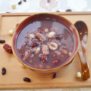 原料:糯米、黑米、大红豆、小红豆、花生、莲子、红枣、桂圆干、冰糖。