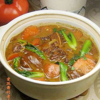 原料:连皮带骨羊肉、胡萝卜、青菜心、油、盐、糖、料酒、姜、蒜、八角、桂皮、辣椒、老抽、鸡精。