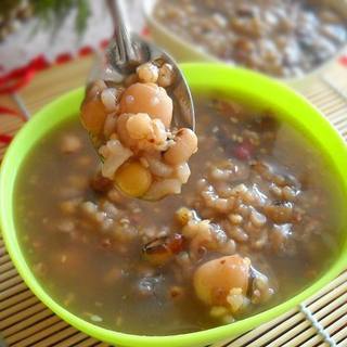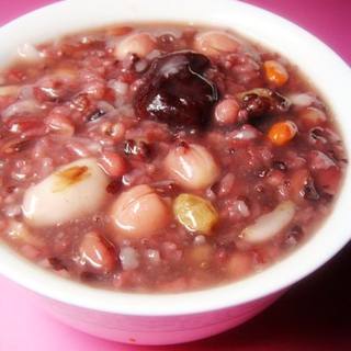 原料:糯米、薏米、黑米、红小豆、莲子、百合、葡萄干、红枣、枸杞、冰糖。