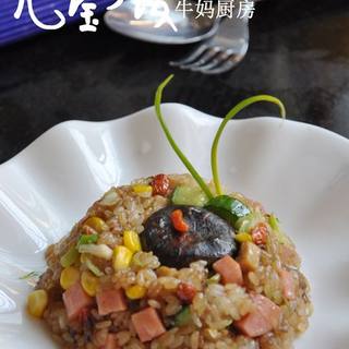 原料:糯米、花菇、火腿、玉米颗、松仁、包菜、黄瓜、豆干、鸡蛋、盐、酱油、料酒。