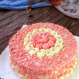 原料:8寸戚风蛋糕、动物性鲜奶油、细砂糖、红色素。