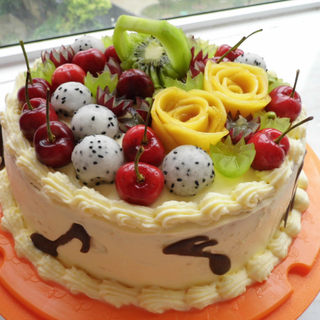 原料:鸡蛋、低筋面粉、植物油、牛奶、糖、动物性淡奶油、糖、朗姆酒、樱桃、葡萄、青提、芒果、奇异果、火龙果、巧克力笔、白醋。