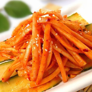 原料:桔梗、黄瓜、葱、蒜、辣椒碎、辣椒酱、白糖、白醋、盐、芝麻、香油、虾酱。