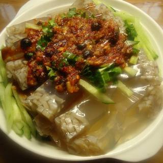 原料:猪皮、姜、花椒、八角、黄瓜丝、香菜、生抽、醋、盐、糖、花椒粉、辣椒油、豆豉酱、蒜泥。