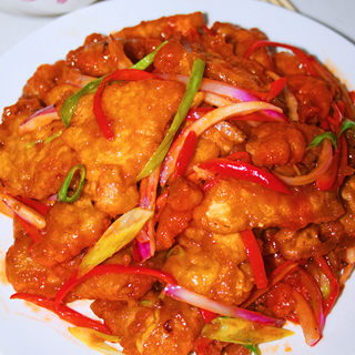 原料:里脊肉、干淀粉、鸡蛋、面粉、黑胡椒、番茄酱、白砂糖、洋葱、红辣椒。