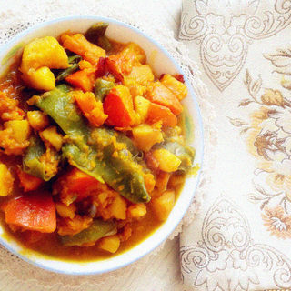 原料:豆角、南瓜、地瓜、五花肉、姜、蒜、盐。