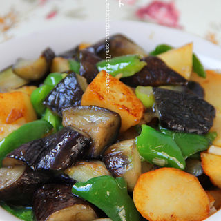 原料:茄子、土豆、青椒、葱、姜、蒜、花椒、料酒、酱油、盐、糖。