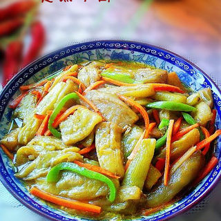 原料:茄子、胡萝卜、青椒、葱、姜、蒜、油、酱油、料酒、盐、味精、醋、淀粉。