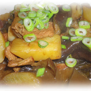 原料:紫长茄、猪肉、土豆、红薯汤粉、葱花、大蒜、花生油、酱油、白糖、食盐、鸡精。